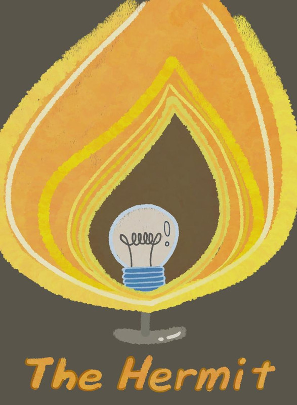 은둔자는 세상의 소음을 잠시 멈추고 내면의 길을 찾는 순간을 상징합니다. 이 그림에서는 전통적 랜턴 대신 전구로 표현되며, 일상에서 발견되는 작은 지혜의 순간을 시각화했습니다.